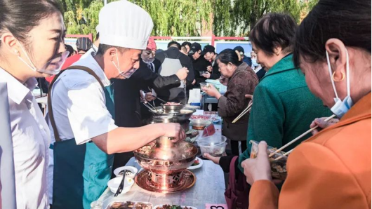 當天,社區20多家餐飲企業(yè)展開(kāi)美食大比拼,精心準備了50多種特色美食。展位上,素菜、葷菜、涼菜、熱菜應有盡有,圍觀(guān)的居民早早自覺(jué)排好了長(cháng)隊?!袄详?,你快點(diǎn)過(guò)來(lái),今天有美食節!啥好吃的都有,可熱鬧了!”居民王迎拿著(zhù)碗筷,趁排隊間隙打電話(huà)招呼朋友們趕緊參與活動(dòng)。
