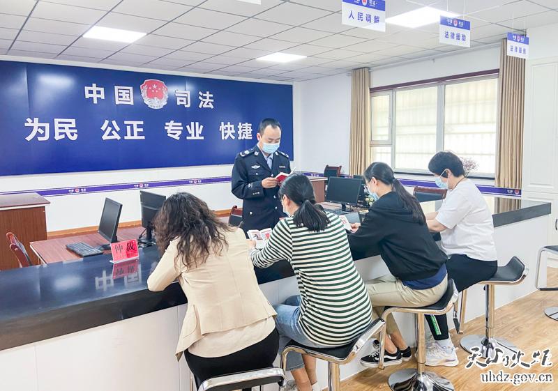 工作隊給轄區居民發(fā)放民法典相關(guān)宣傳資料