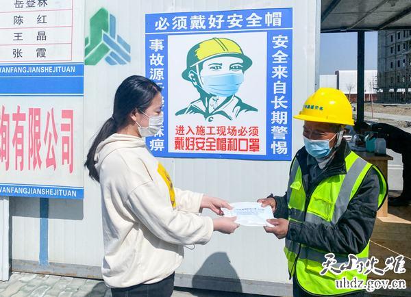 工作隊隊員為工地工人發(fā)放醫用口罩