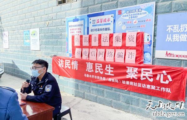 為進(jìn)一步提高社區居民防范非法集資和電信網(wǎng)絡(luò )詐騙的意識和能力,切實(shí)維護居民群眾根本利益,近日,烏魯木齊市商務(wù)局駐景苑社區“訪(fǎng)惠聚”工作隊聯(lián)合社區組織開(kāi)展了一場(chǎng)群眾面對面“守護好您的錢(qián)袋子”防詐騙宣傳活動(dòng),警、民、社區同心共筑反詐銅墻鐵壁。