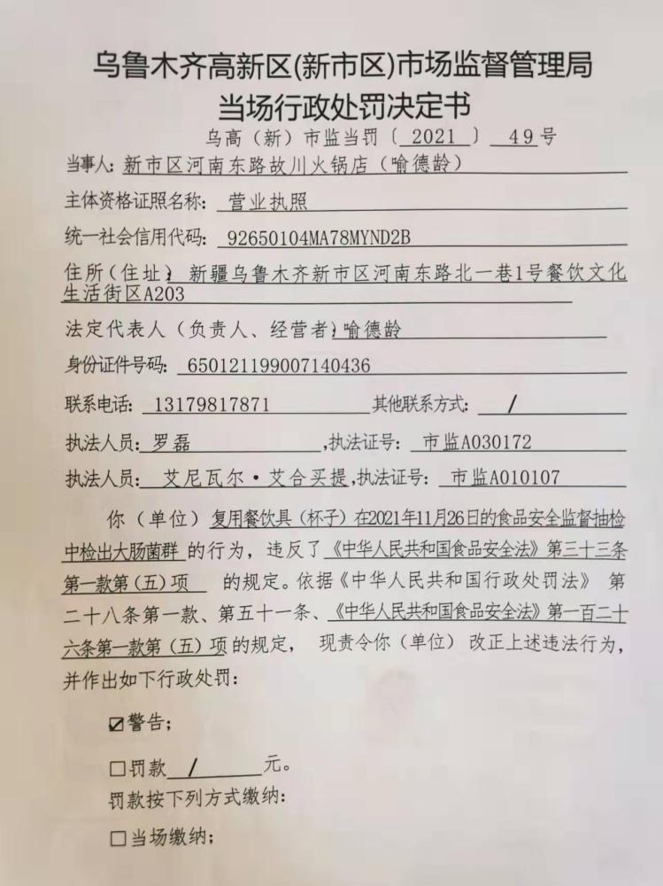 2021年11月26日新疆維吾爾自治區產(chǎn)品質(zhì)量監督檢驗研究院受新疆維吾爾自治區市場(chǎng)監督管理局的委托對新市區河南東路故川火鍋店使用的復用餐飲具(杯子)進(jìn)行了食品安全監督抽檢,抽樣基數420套,樣品數量2片。2021年12月3日出具了《檢驗報告》,檢驗結論為:經(jīng)抽樣檢驗,大腸菌群項目不符合GB 14934-2016《食品安全國家標準消毒餐(飲)具》要求,檢驗結論為不合格。檢驗項目:大腸菌群,50cm2,標準指標:不得檢出,實(shí)測值:檢出。