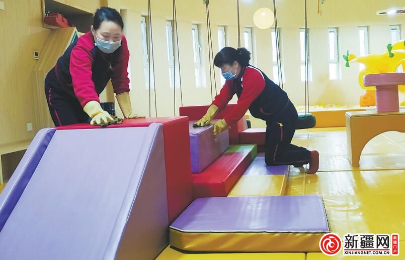 10月20日上午,在烏魯木齊市第三十幼兒園室內游樂(lè )園,工作人員正在對游樂(lè )設施進(jìn)行衛生清潔。 (記者李曉青攝)