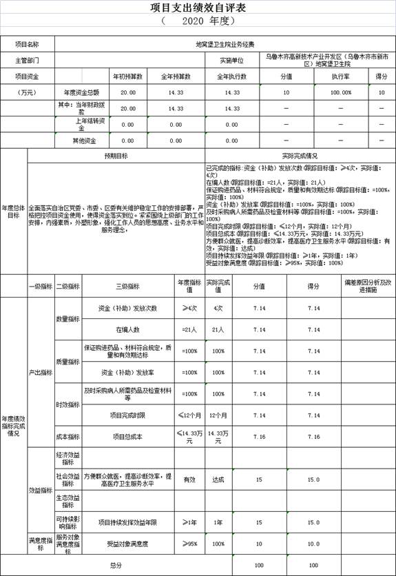 根據預算績(jì)效管理要求,我單位2020年度開(kāi)展預算績(jì)效評價(jià)項目2個(gè),共涉及資金123.81萬(wàn)元。預算績(jì)效管理取得的成效:一是2020年度財政資金到位及時(shí)有保障,不存在截留、挪用、滯留等情況;二是不存在違規發(fā)放人員工資、違規支出資金的情況;三是保證了單位職能的正常運行,也保障了各項目的順利實(shí)施;四是各項目支出及時(shí)、有效;年初制定的重點(diǎn)工作、工作計劃、績(jì)效目標均已完成;并實(shí)現了預期的效果。發(fā)現的問(wèn)題及原因:一是對各項指標和指標值要進(jìn)一步優(yōu)化、完善,主要在細化、量化上改進(jìn),二是自評價(jià)工作還存在自我審定的局限性,會(huì )影響評價(jià)質(zhì)量,容易造成問(wèn)題的疏漏,在客觀(guān)性和公正性上說(shuō)服力不強,三是缺少帶著(zhù)問(wèn)題去評價(jià)的意識,四是現場(chǎng)評價(jià)的工作量少,后續效益評價(jià)具體措施和方法較少。下一步改進(jìn)措施:一是要繼續加強對績(jì)效監控工作重要性的宣傳。要充分利用政府門(mén)戶(hù)站、財政相關(guān)會(huì )議和各類(lèi)財政培訓,加強績(jì)效監控工作的宣傳力度,倡導預算績(jì)效管理理念,有效引導各部門(mén)人員了解支持預算績(jì)效管理、監督績(jì)效結果應用,共同營(yíng)造“講績(jì)效、重績(jì)效、用績(jì)效”的良好氛圍;二是加強人員培訓,完善績(jì)效評價(jià)監控的人員崗前培訓及落實(shí),不斷提高績(jì)效監控工作人員對預算績(jì)效管理的思想認識和業(yè)務(wù)能力,進(jìn)一步改進(jìn)工作方式,提升工作水平和工作效率;三是進(jìn)一步梳理財政預算績(jì)效管理規程,建立健全相關(guān)管理制度,明晰預算績(jì)效審核、抽查和評價(jià)等業(yè)務(wù)流程,促進(jìn)預算績(jì)效管理規范化、科學(xué)化和精細化;四是預算執行與績(jì)效運行“雙監控”已成為預算管理常態(tài)。通過(guò)進(jìn)行多方面多層次的學(xué)習培訓,努力提高相關(guān)人員的業(yè)務(wù)素質(zhì),才能真正將預算績(jì)效目標管理工作落到實(shí)處;五是督促各實(shí)施單位將在預算編制環(huán)節通過(guò)事前評價(jià)的方式,發(fā)現并剔除評價(jià)不高的項目,避免了財政資金的浪費。加強在財政資金支出過(guò)程中,及時(shí)根據資金使用進(jìn)度考核階段性目標的完成情況;項目結束后,根據事前設定的績(jì)效目標科學(xué)評判支出的效果,并將評價(jià)結果合理運用于來(lái)年的預算編制中。具體項目自評情況附項目支出績(jì)效自評表。